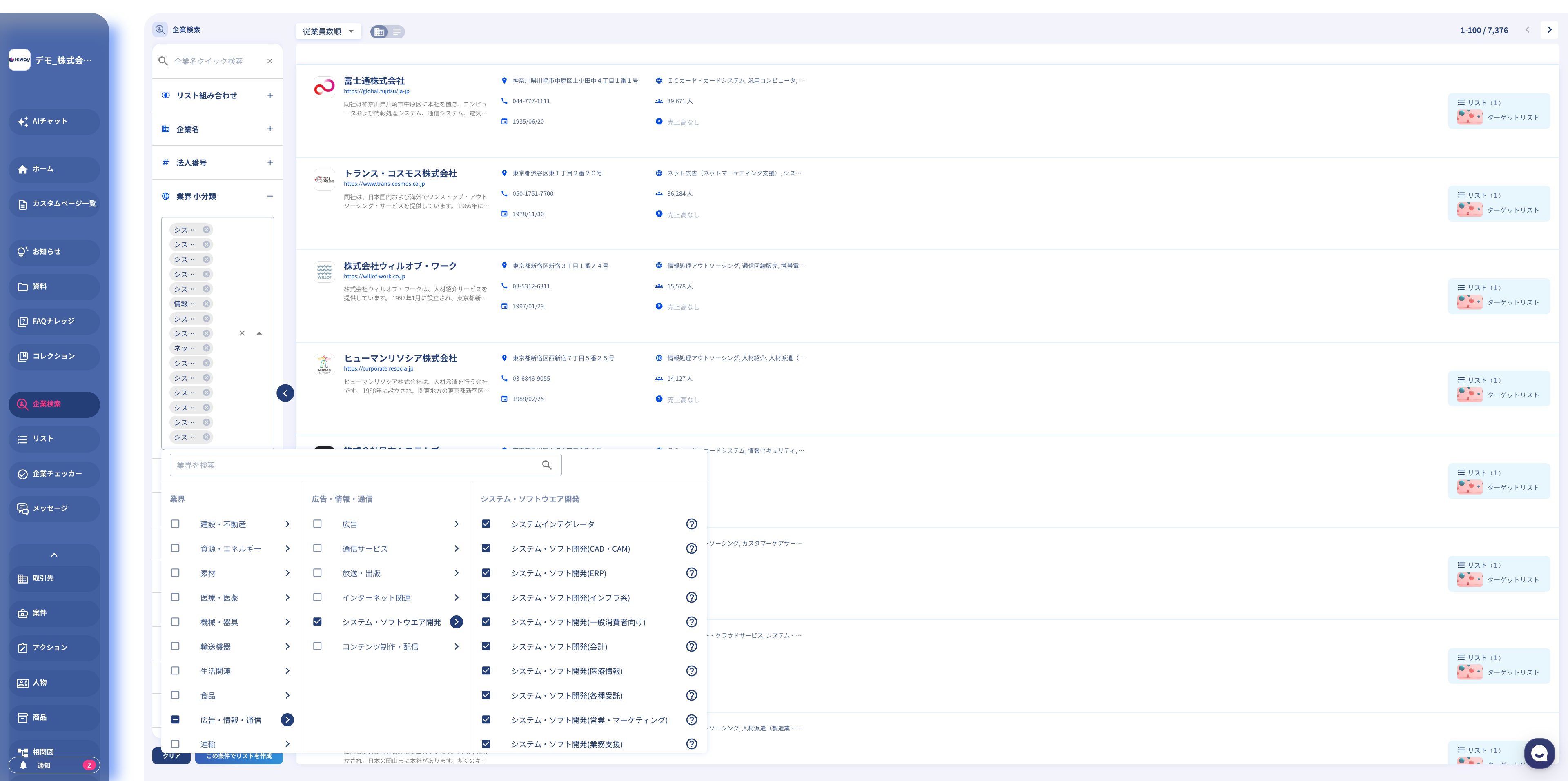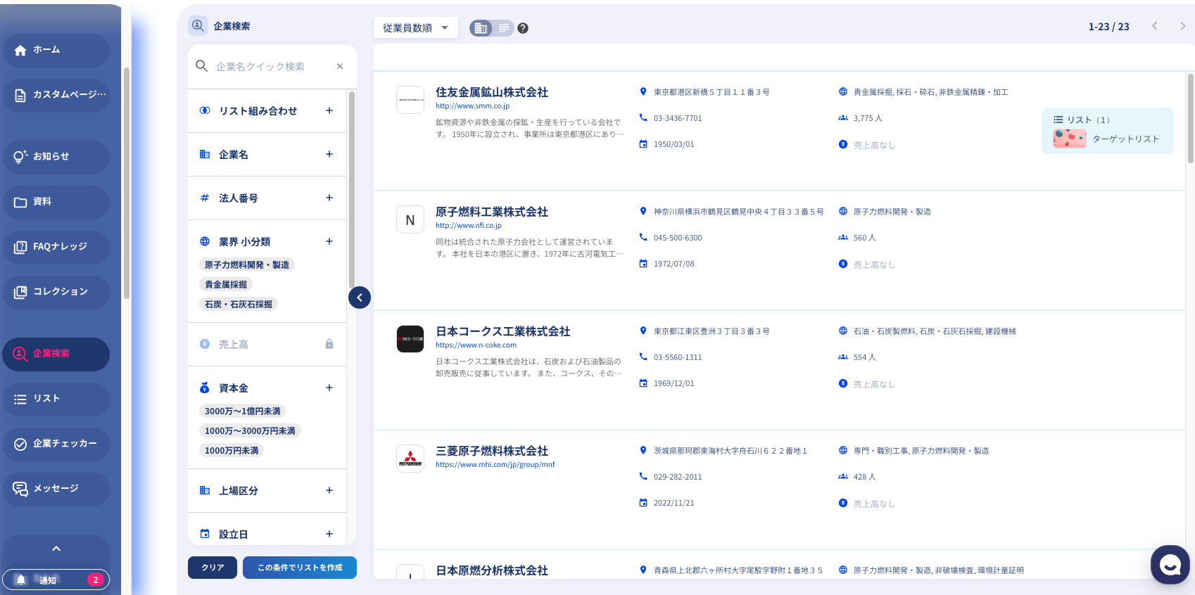 業界・地域・売上高・従業員数・利用ツールなどの条件で企業を絞り込み、営業ターゲットリストを作成できます。企業概要や属性情報など、豊富な情報をもとに精度の高いターゲティングが可能です。