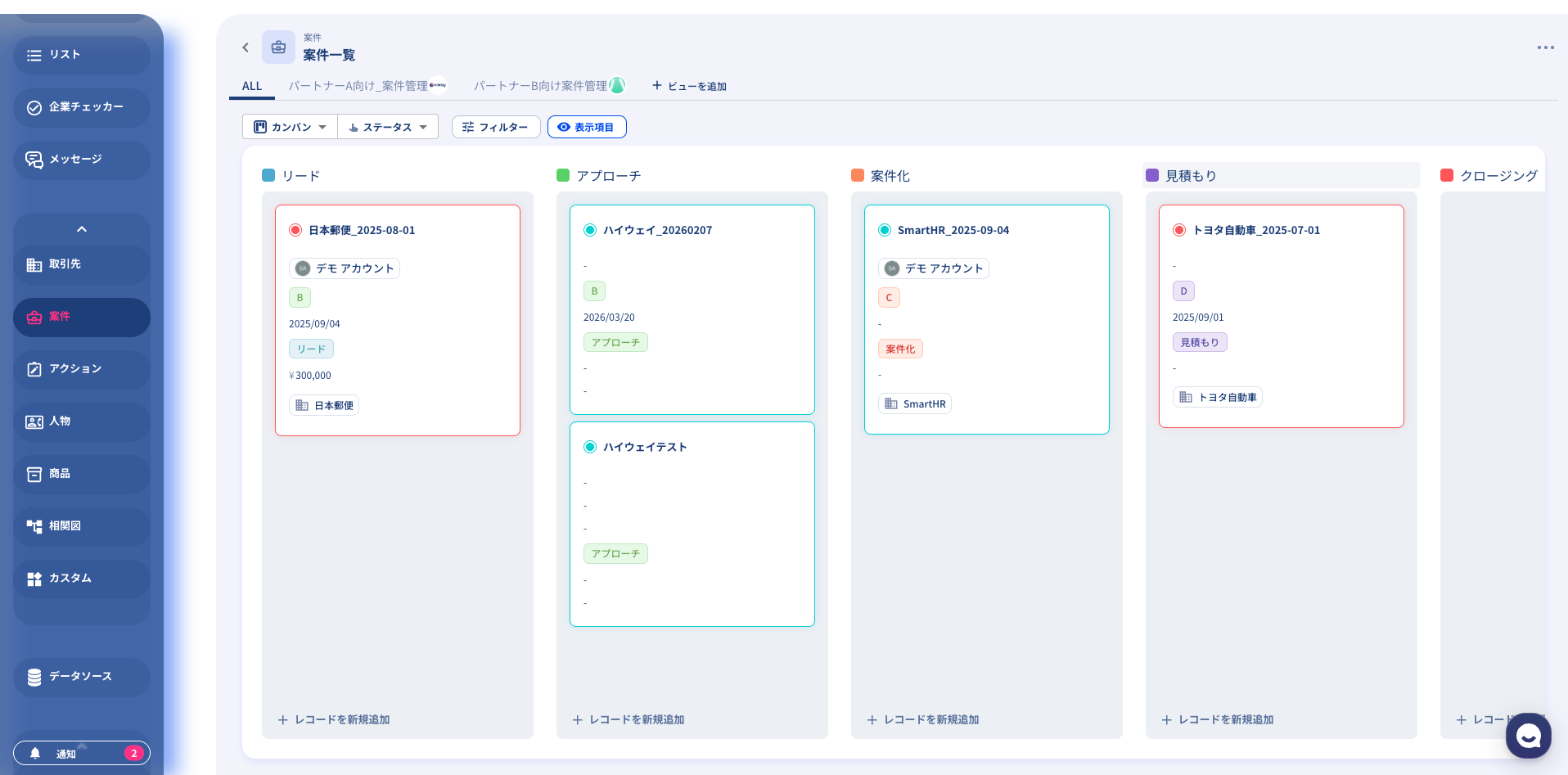 Hiwayには、CRMやSFAなどの顧客データベースと連携できるデータベース機能があります。この顧客・案件管理機能を活用いただくと、顧客や案件の情報管理だけでなく、それらの情報をパートナーと共有し、共同編集などを行うことができます