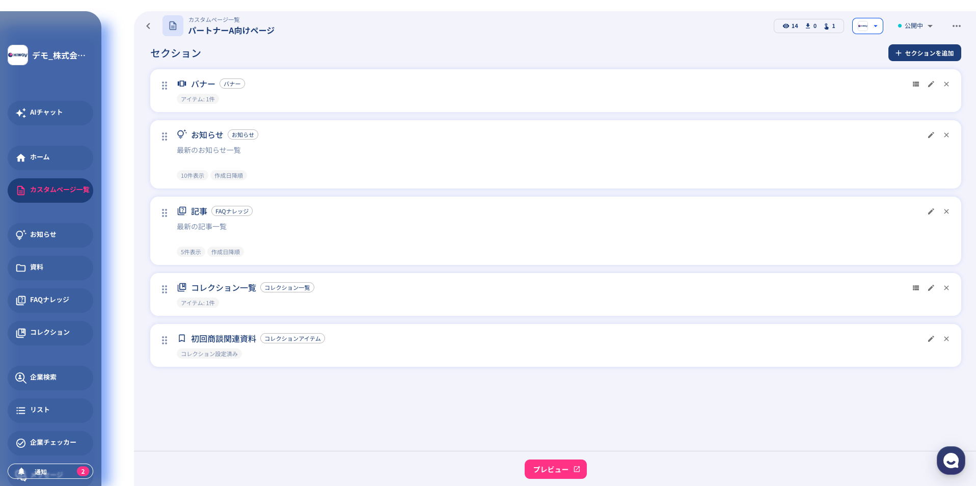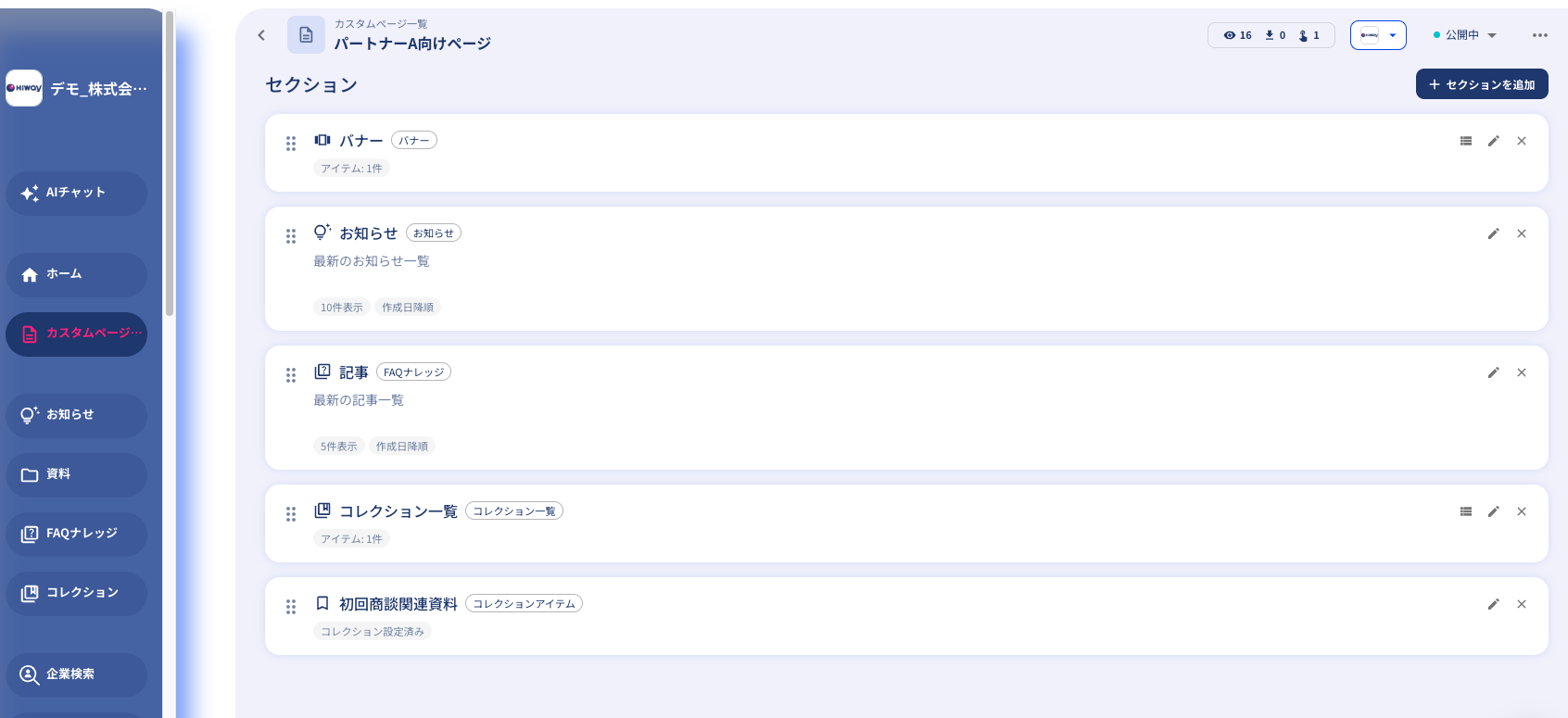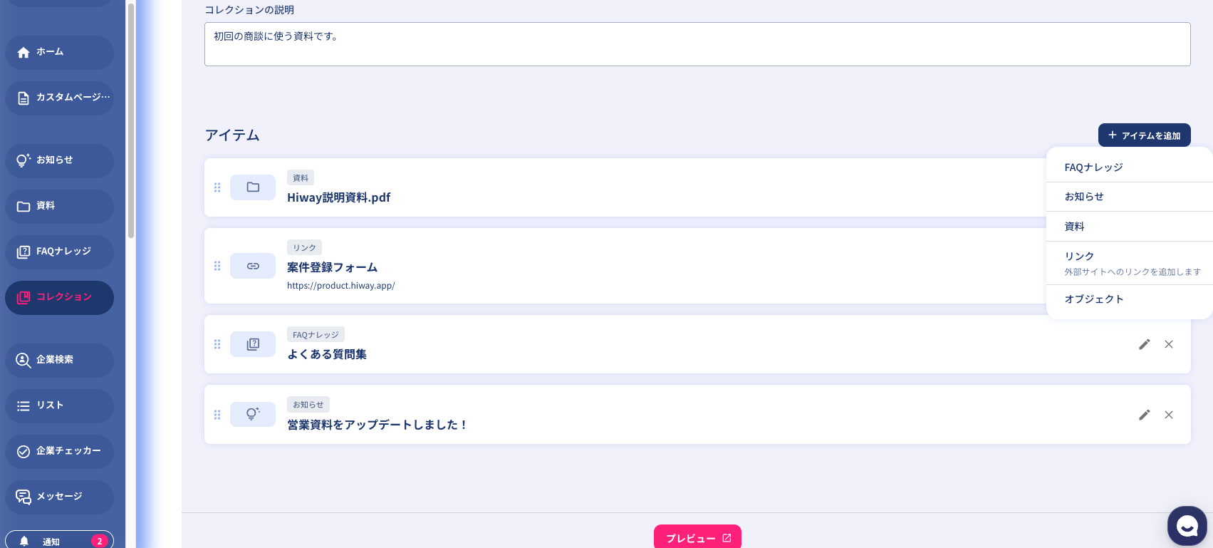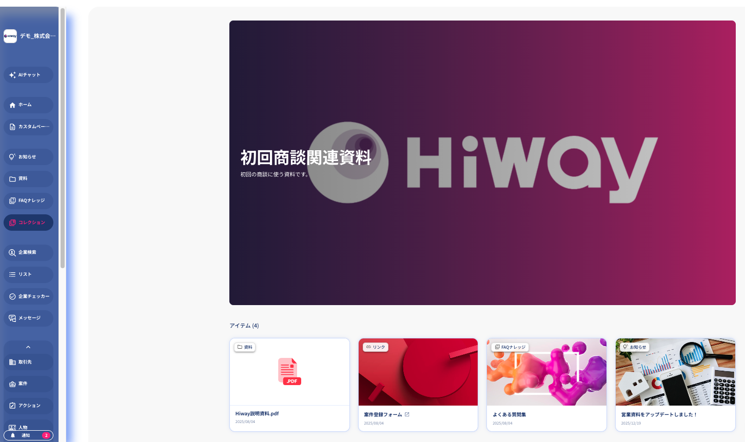 お知らせ・資料・FAQナレッジなどのHiway内部のコンテンツや外部サイトのリンクなどをまとめてコレクションとして管理・共有できます。パートナーごとに必要な情報をパッケージ化して提供することで、情報共有をより効率的に行えます。