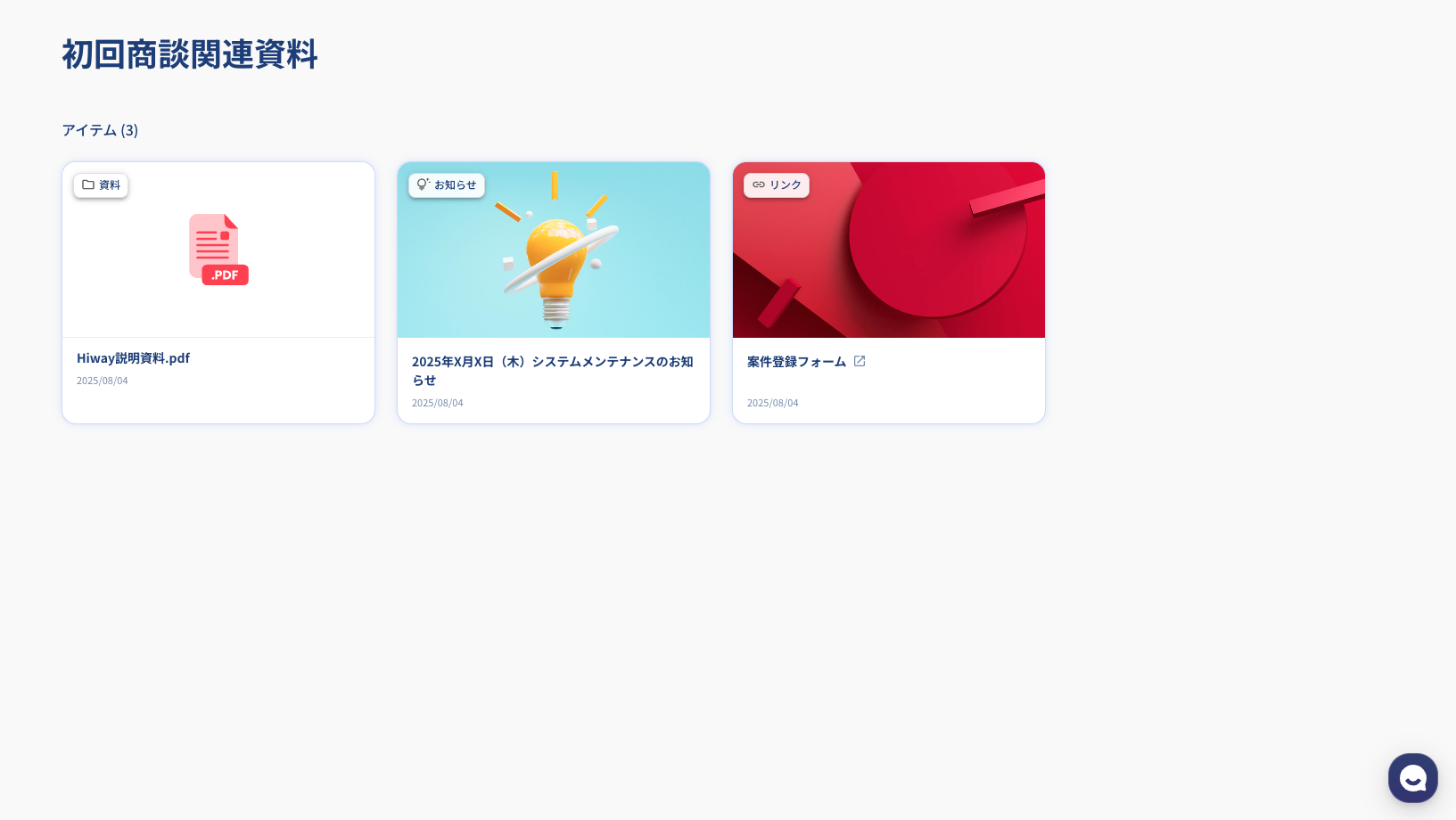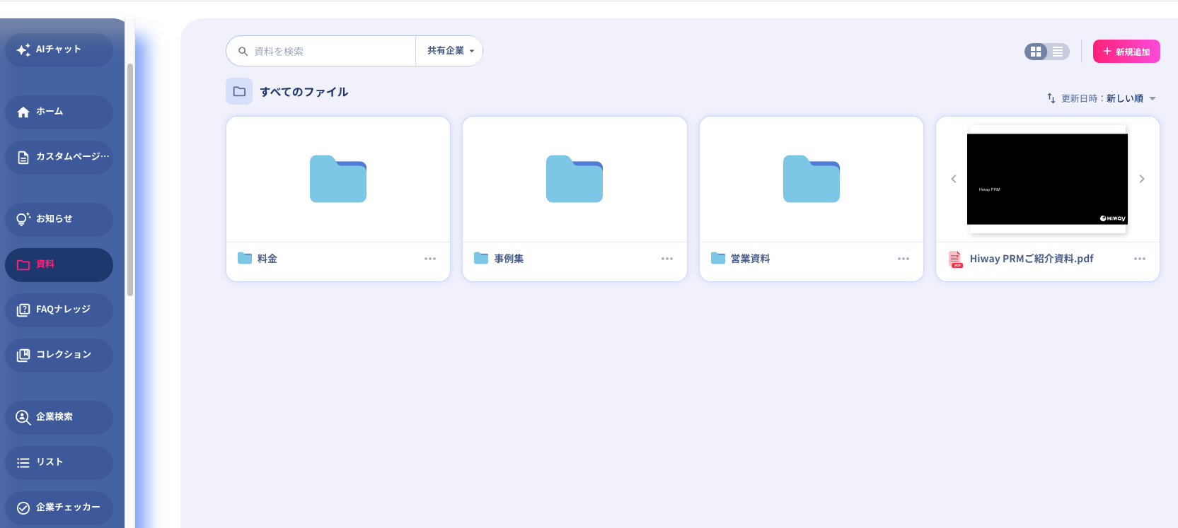 PDFなどのファイルをHiway上にアップロードし、社内・パートナーへ共有できます。オンラインストレージとして活用でき、最新資料を一元管理することで、パートナーが常に正しい情報にアクセスできる環境を整えられます。資料のPDFファイルはAIチャットの検索対象にもなります。