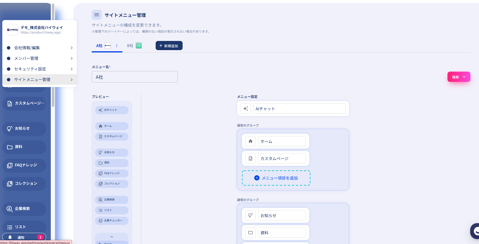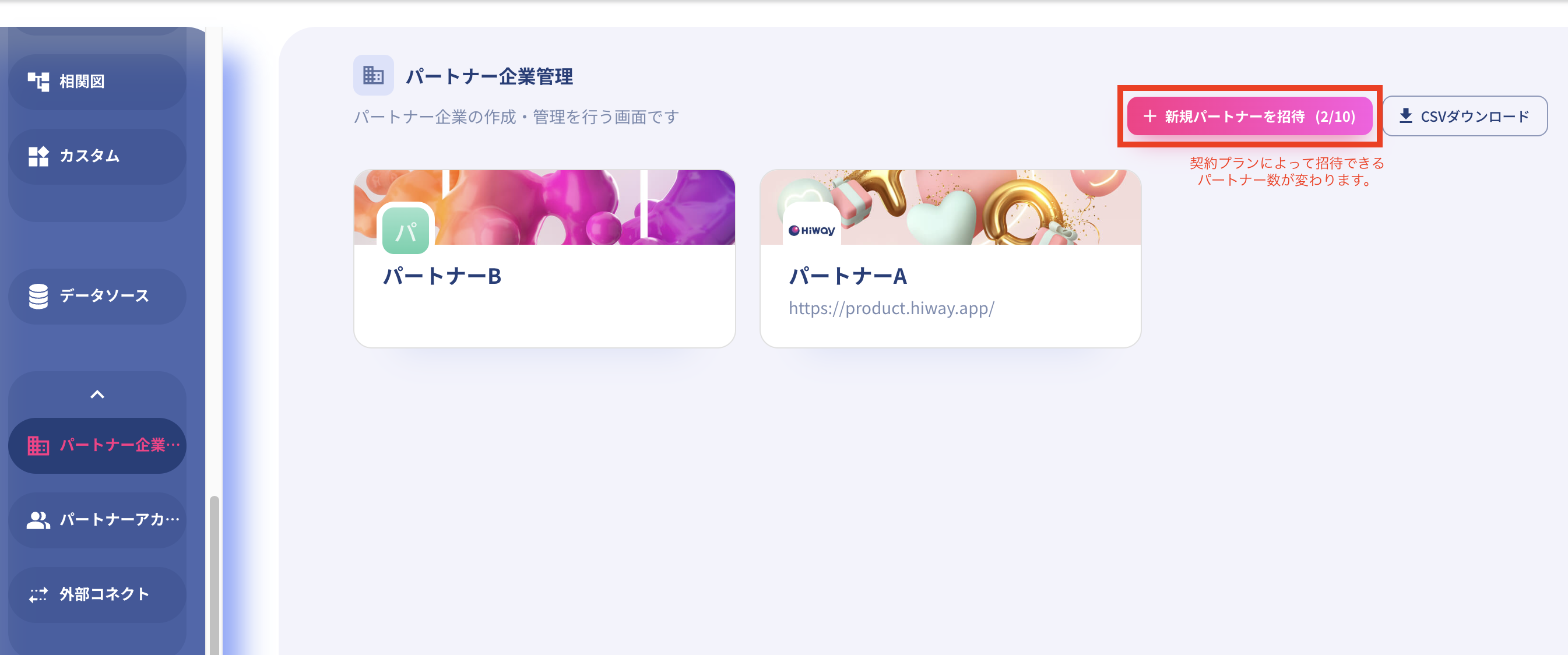 Hiwayにパートナー企業を登録し、パートナーがアクセスするサブワークスペースを構築します。パートナー企業ごとに共有するコンテンツや権限の範囲を設定できます。