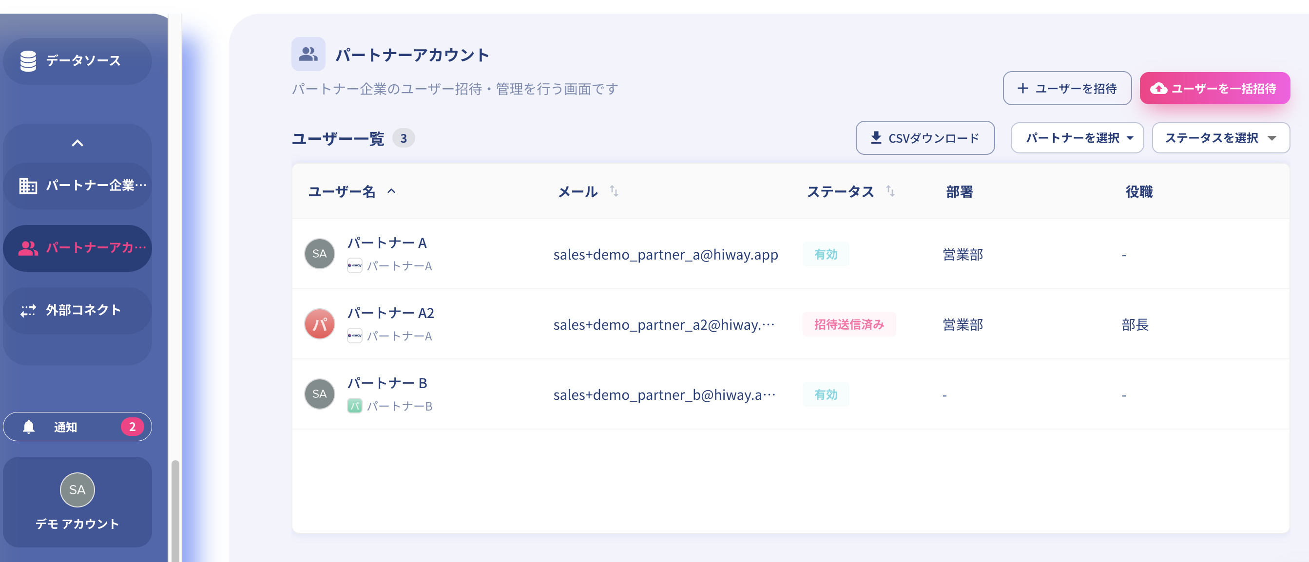 パートナー企業の担当者をユーザーとしてHiwayに招待します。パートナー企業に付与された権限に基づいて、閲覧・編集・管理などの操作ができるようになります。