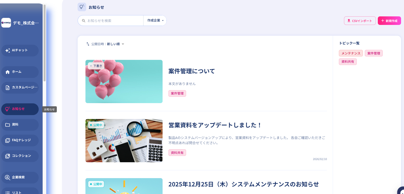 社内やパートナーへ向けて、製品アップデートやキャンペーン情報などをお知らせとして配信できます。メール通知にも対応しており、重要な情報を確実に届けることができます。また、お知らせはAIチャットの検索対象にもなるため、パートナーが必要な情報を素早く見つけられます。