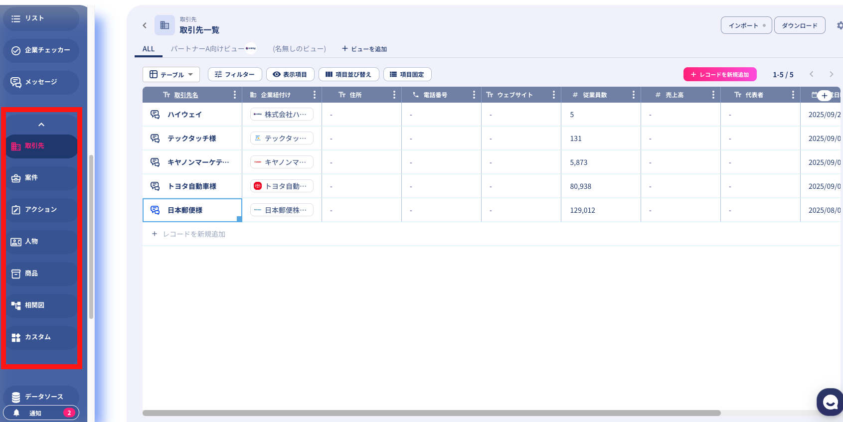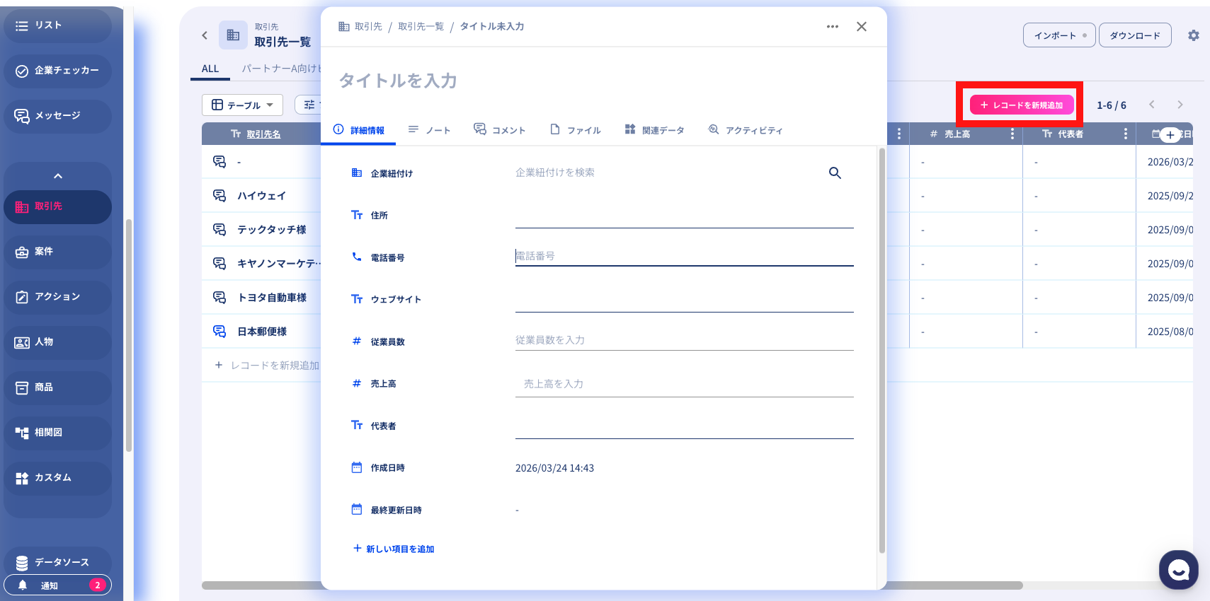 取引先・案件・アクションなど、各フォルダトにレコード(データ)を手動で新規登録できます。取引先・担当者・案件をリレーション(関連付け)でつなぐことで、案件や活動履歴・担当者情報を企業に紐づけるなどのデータ管理ができるようになっております。