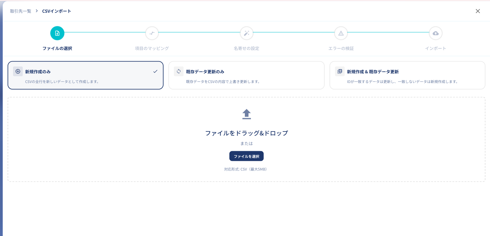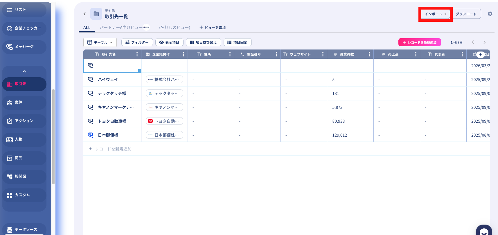 既存のExcelや他ツールのデータをCSV形式でHiwayに一括インポートできます。新規レコードの登録だけでなく、既存レコードの更新にも対応しており、初期導入時の移行や定期的なデータ更新をスムーズに行えます。インポートされた取引先データは、Hiwayの企業データベースと名寄せすることも可能です。