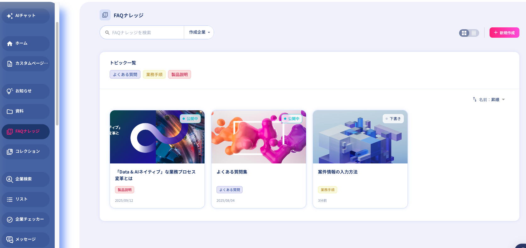 よくある質問や業務手順、製品説明などをナレッジ記事として作成・管理できます。トピック(カテゴリ)で分類し、社内・パートナー・特定企業ごとに公開範囲を設定することが可能です。FAQナレッジもAIチャットの検索対象となるため、パートナーからの問い合わせ対応を大幅に削減できます。