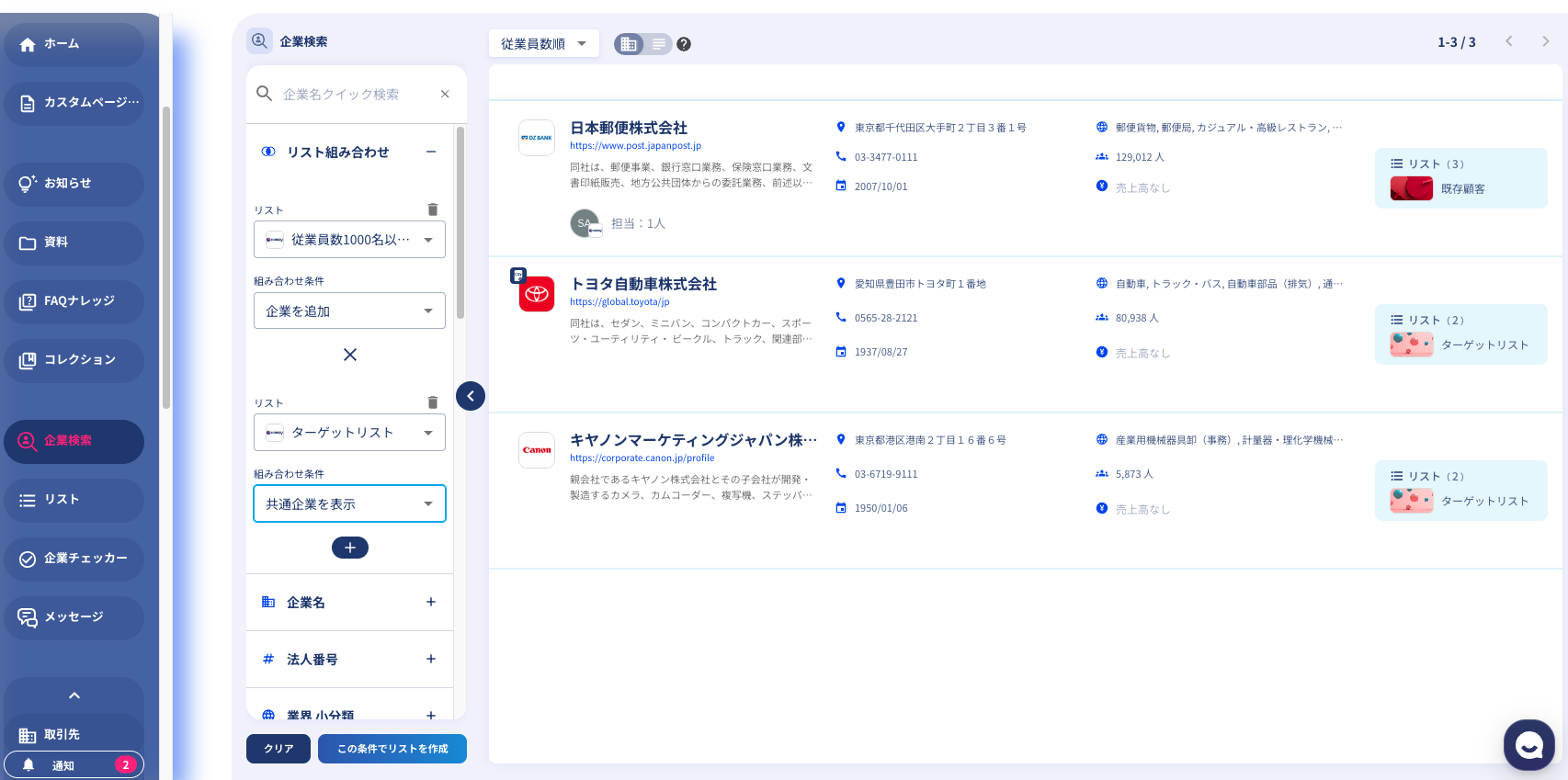 絞り込んだ検索条件を「リスト」として保存・再利用できます。作成したリストはパートナー企業に共有でき、「リストの組み合わせ」機能を使って自社とパートナーのリストをマッピングすることで、共通ターゲット・ホワイトスペース(未開拓領域)・競合エリアを可視化できます。