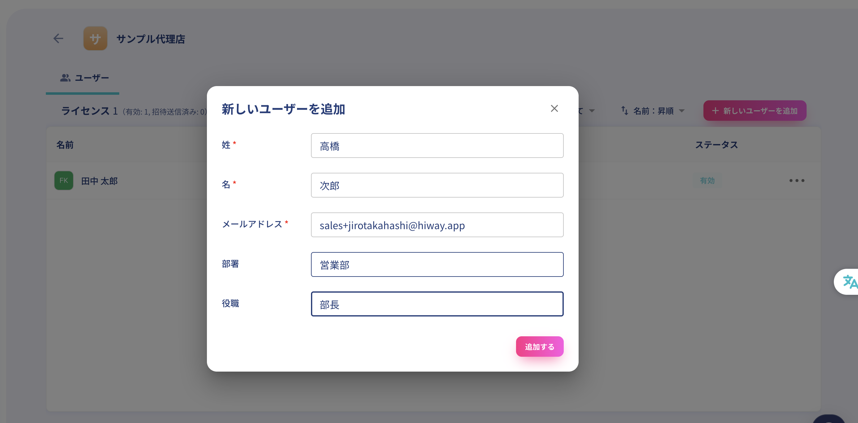 以下の情報を入力します: - 姓(必須) - 名(必須) - メールアドレス(必須) - 部署(任意) - 役職(任意)