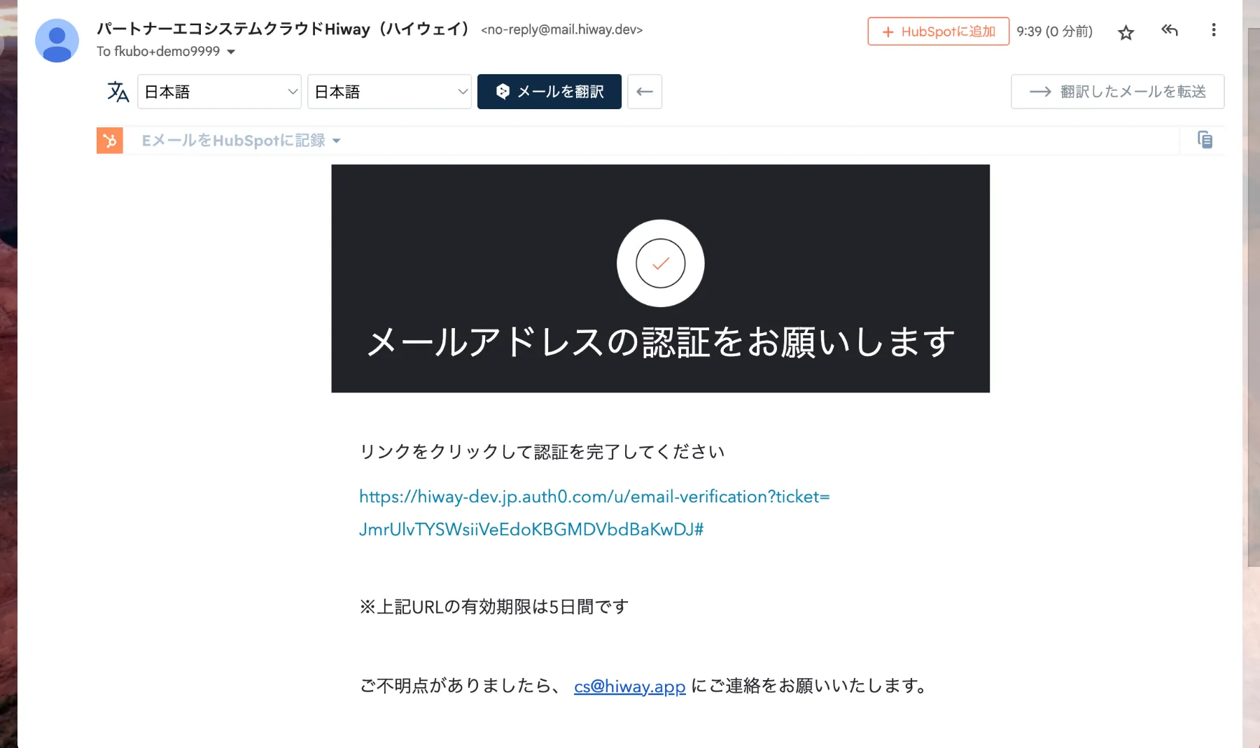 システムから「メールアドレスの検証をお願いします」というメッセージが来ますのでメール内の URLをクリックします。(URLの有効期限は5日間のためご注意ください。)