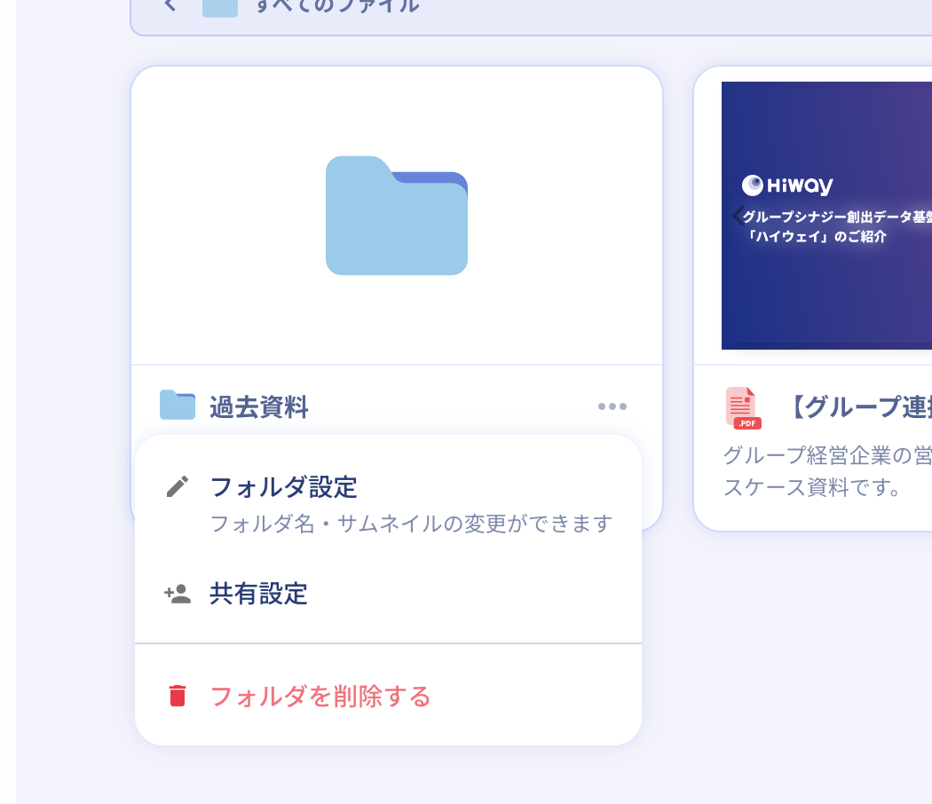 Hiwayの「資料共有機能」は、社内・パートナー企業(代理店)に向けて、画像・PDF・動画・ドキュメントなどのファイルを安全に管理・共有できるクラウドストレージ機能です。
